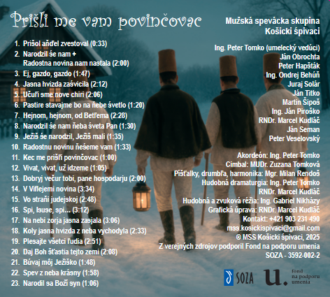 Nakoniec sa nám podarilo CD nachystať, nahrať a v tomto predvianočnom čase ho chceme uviesť do života (21. december 2025, kostol Furča). Hudobný doprovod na cimbale bravúrne zvládla Zuzana Tomková, o píšťalky, drumbľu, ústnu harmoniku sa postaral Milan Rendoš. Samotné CD obsahu 23 známych i menej známych kolied z (nielen) východného Slovenska doplnených o krátke vinše. Ako to už býva, všetky sú tak trošku v našom štýle, v radostnejšom podaní a s prevládajúcim folklórnym motívom.